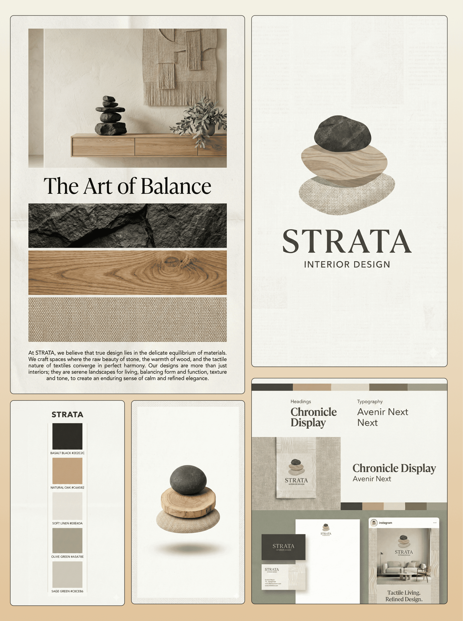 In a 15–30 minute sprint, we built a complete pitch concept for an interior design studio: STRATA. Not a moodboard. Not a list of adjectives. A coherent direction you could put in front of a client and let them react to something real.